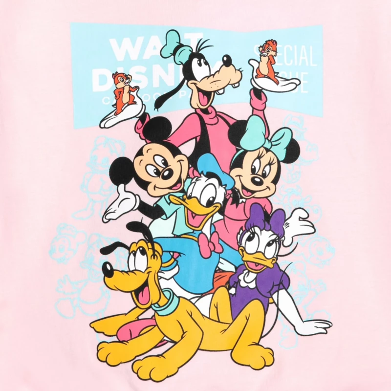 Mickey, Minnie all their cartoon pals share a happy greeting with passers-by from the front of this soft jersey tank tee featuring friendly graphics and a tie-up hem.
