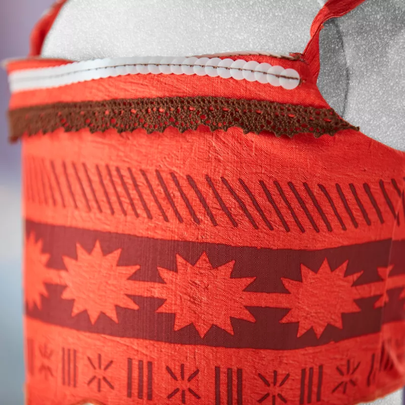 - Bottom layer features acetate lining with textured fabric paneling with straw-like print