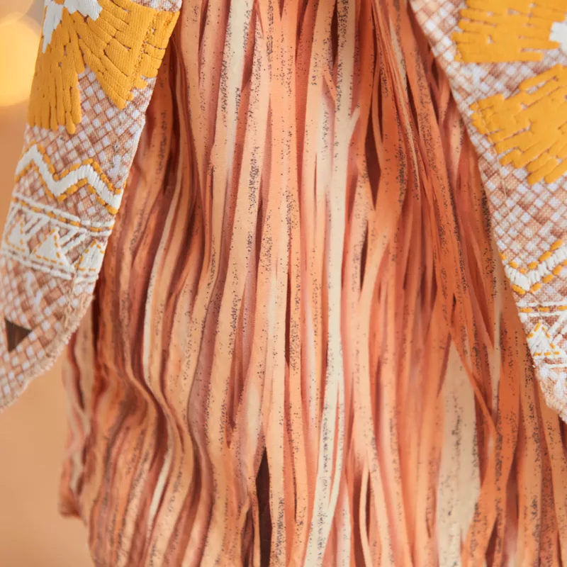 - Second layer with zig zag hem, Polynesian-inspired print, and raised puff ink screen art