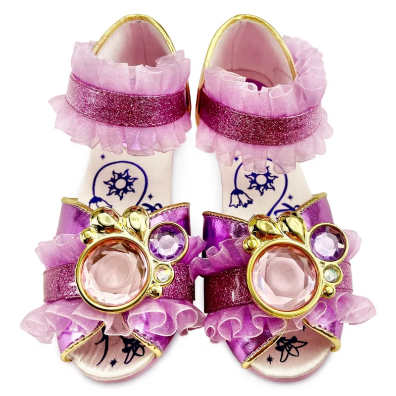 Your captivating Princess will step out into a world of pure fantasy wearing these glittering ankle strap shoes. Featuring golden trims, organza ruffles, and faceted gem adornments, they are made to match perfectly with our Rapunzel costume collection.